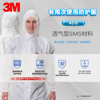 3M 欧标5级防化服 ,4515-L ,白色带帽连体防护服